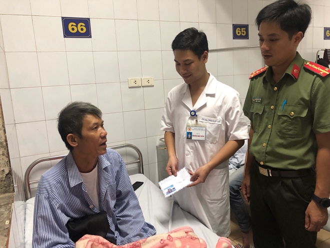 | Đại diện Đoàn Thanh niên Bệnh viện 19-8 và Đại học Cảnh sát PCCC trao quà cho các bệnh nhân mắc trọng bệnh và có hoàn cảnh khó khăn. |