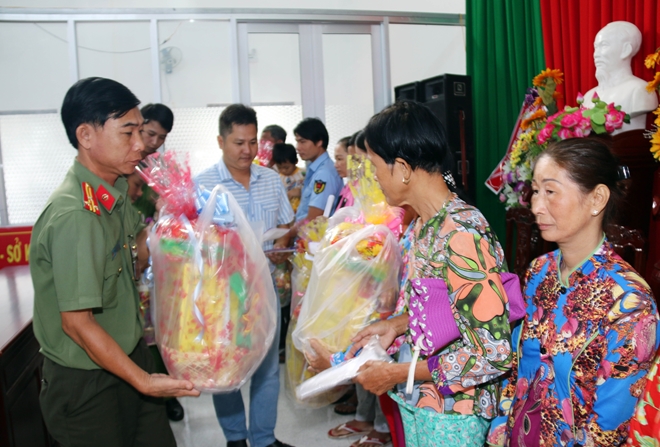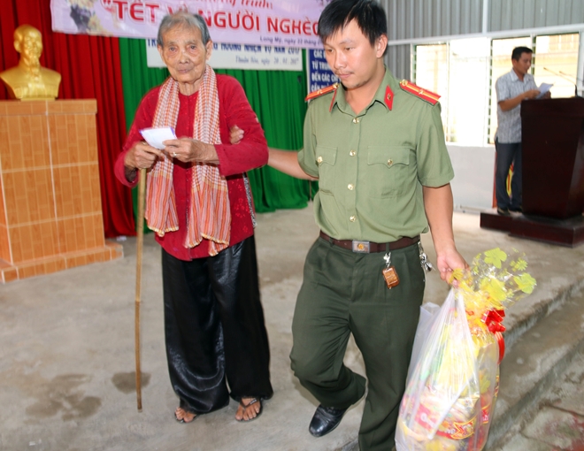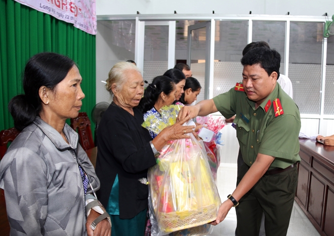 | Đại diện Công an tỉnh Hậu Giang, tặng quà gia đình chính sách, hộ nghèo thị xã Long Mỹ. |