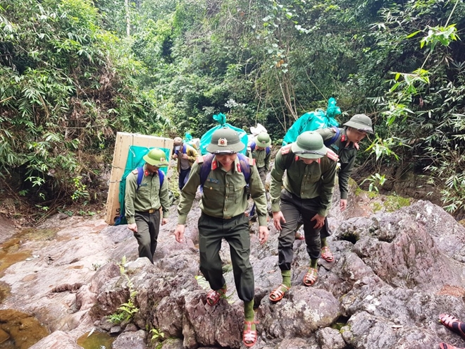 | Cán bộ, chiến sĩ Công an Quảng Bình gùi hàng trèo đèo vượt suối vào bản Dốc Mây, xã Trường Sơn, huyện Quảng Ninh tặng bà con. |