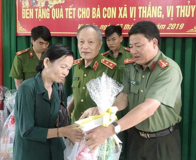 | Trung tướng Nguyễn Xuân Xinh cùng đại diện Báo CAND, tặng quà hộ nghèo, gia đình chính sách xã Vị Thắng và Vị Thủy, huyện Vị Thủy (Hậu Giang). |
