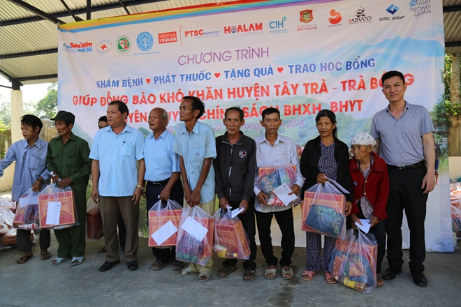 Trước đó, ngày 19-4, tại huyện Tây Trà (Quảng Ngãi), đoàn thiện nguyện cũng đã tổ chức khám chữa bệnh, phát thuốc, tặng quà cho 400 bà con đồng bào Cor. Tây Trà được xem là huyện nghèo nhất không chỉ của Quảng Ngãi mà còn của cả nước với hơn 82% dân số thuộc diện nghèo và cận nghèo. Tại đây, đoàn cũng trao 40 suất học bổng cho các các em HS có thành tích học tập tốt, có tinh thần vượt, trị giá 1.000.000 đồng/suất.