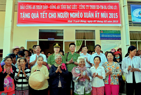 | Đại diện Báo CAND, lãnh đạo Công an tỉnh Bạc Liêu, Công ty TNHH XD-TM-DL Công Lý, lãnh đạo Thành ủy, UBND TP Bạc Liêu cùng người dân nghèo xã Vĩnh Trạch Đông tại buổi trao quà. |