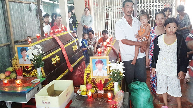 | Vợ chồng anh Tuấn bên quan tài hai con. |
