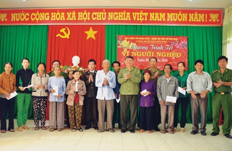 | Trung tướng Lê Ngọc Nam cùng đại diện Báo CAND, Công an tỉnh Quảng Ngãi, Công an huyện Đức Phổ trao quà tặng người nghèo xã Phổ An. |