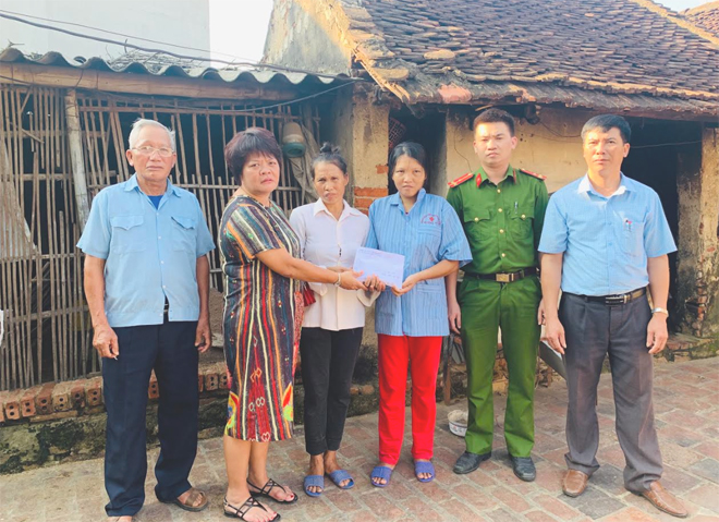 | Đại diện Công an Thanh Hoá và chính quyền xã Phong Lộc, huyện Hậu Lộc trao 50 triệu đồng của các nhà hảo tâm cho mẹ con bà Trịnh Thị Dân. |