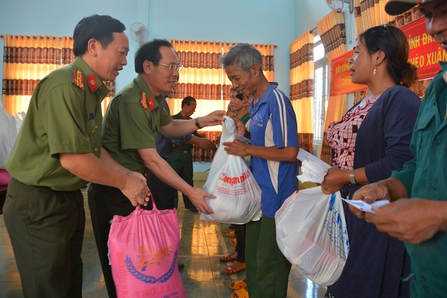 Đại tá Trần Thanh Phong, Phó Tổng biên tập Báo CAND trao quà Tết cho bà con nghèo xã Trường Xuân