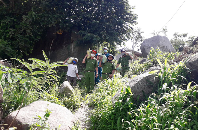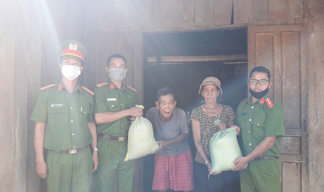 Công an huyện Krông Nô đến tận nhà trao tặng những phần gạo cho người nghèo để cùng chia sẻ khó khăn trong mùa dịch COVID-19. |
