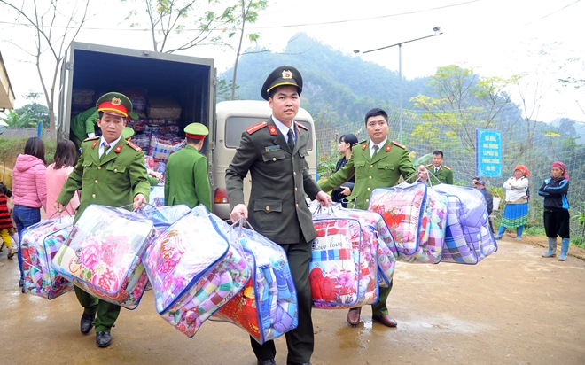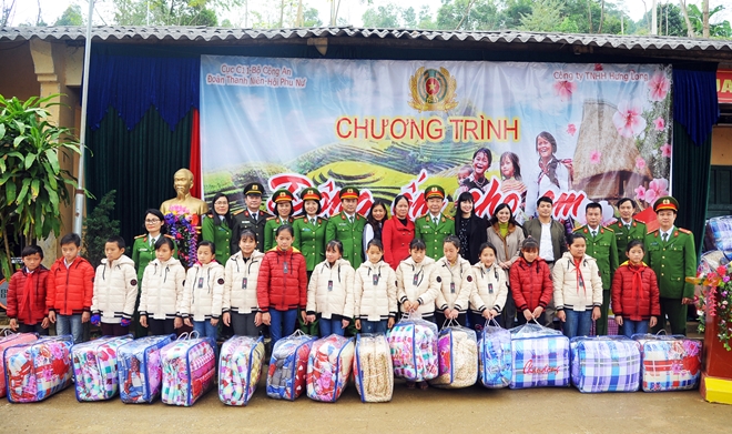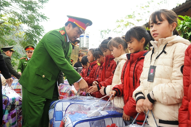 | Tuổi trẻ CAND động viên, tặng quà các em học sinh nghèo vùng cao xã Xuân Lạc. |