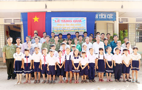 | Cán bộ, chiến sĩ Phòng An ninh kinh tế - Công an tỉnh Bình Dương tặng quà các em học sinh nghèo hiếu học. |