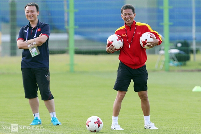 | Chiến lược gia người Khánh Hoà luôn tươi cười với các học trò. Ông chủ động cởi bỏ mọi áp lực để truyền sự thoải mái trước trận đấu quan trọng. Ảnh: Vne. |
