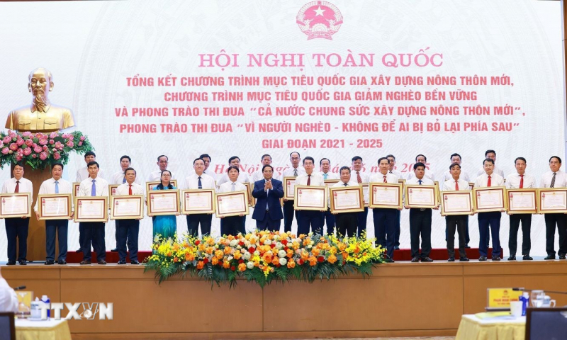 Tại hội nghị, thay mặt lãnh đạo Đảng, Nhà nước, Thủ tướng Phạm Minh Chính trao các phần thưởng cao quý của Chủ tịch nước và Thủ tướng Chính phủ tặng 306 tập thể, cá nhân trên toàn quốc có thành tích xuất sắc trong thực hiện Chương trình mục tiêu quốc gia xây dựng nông thôn mới, Chương trình mục tiêu quốc gia giảm nghèo bền vững và Phong trào “Cả nước chung sức xây dựng nông thôn mới,” Phong trào “Vì người nghèo - Không để ai bị bỏ lại phía sau”.