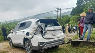 Vượt ẩu, xế hộp bị tàu hỏa hất văng xuống ruộng, 5 người thoát chết