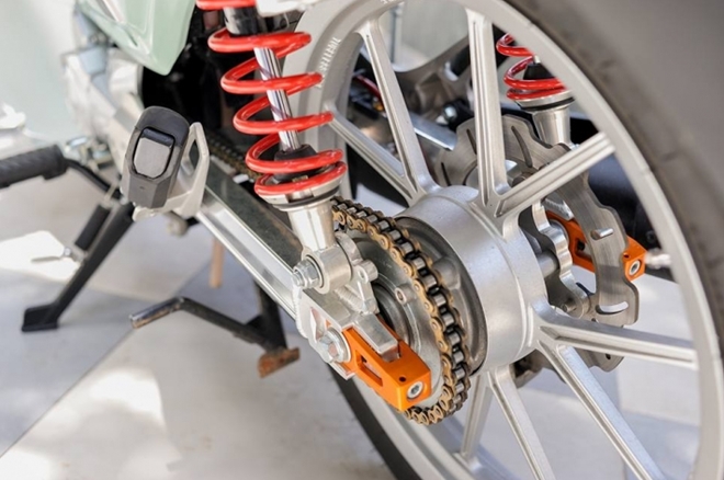 Bộ gắp sau xe cũng được độ lại với gắp nhôm nhẹ nhàng nhưng đầy cứng cáp. Ngoài ra, cặp phuộc hàng hiệu YSS màu sơn đỏ chính là điểm nhấn nổi bật trên xe.