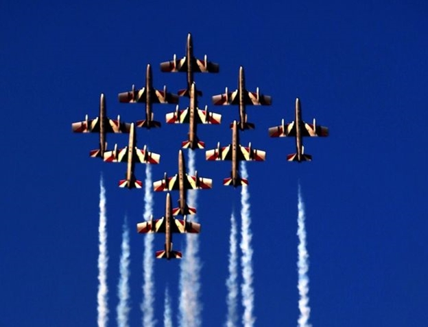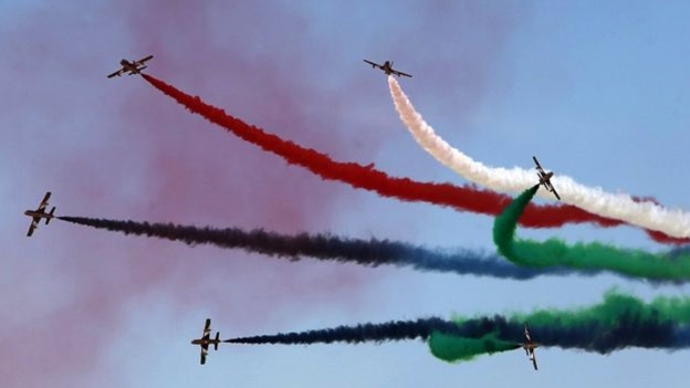 | Đội bay nhào lộn Al-Fursan thuộc không lực UAE biểu diễn tại Triển lãm. |