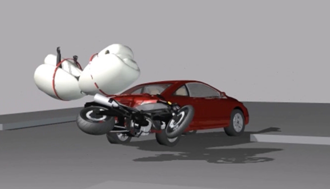 Tình huống mô phỏng tai nạn giao thông xảy ra giữa xe mô tô và ô tô được thể hiện dưới dạng video 3D. Theo đó, hệ thống túi khí được tích hợp trong yên xe sẽ hoạt động và bao bọc toàn bộ cơ thể người lái ngay sau khi xảy ra va chạm.