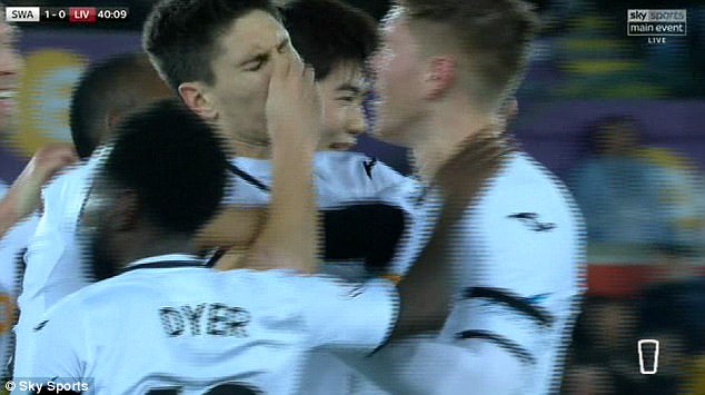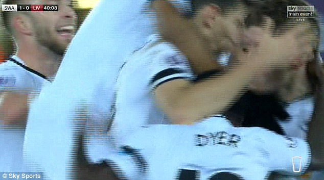 | Pha ăn mừng "phấn khích" của các cầu thủ Swansea. Ảnh: Sky |
