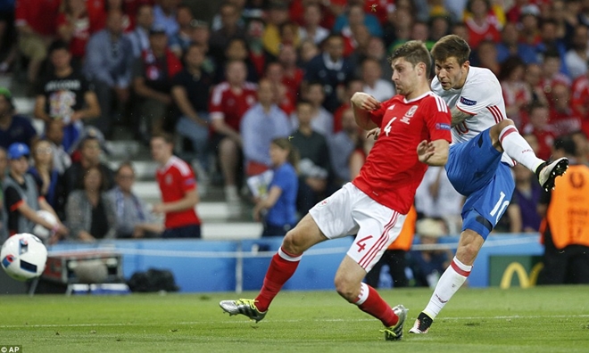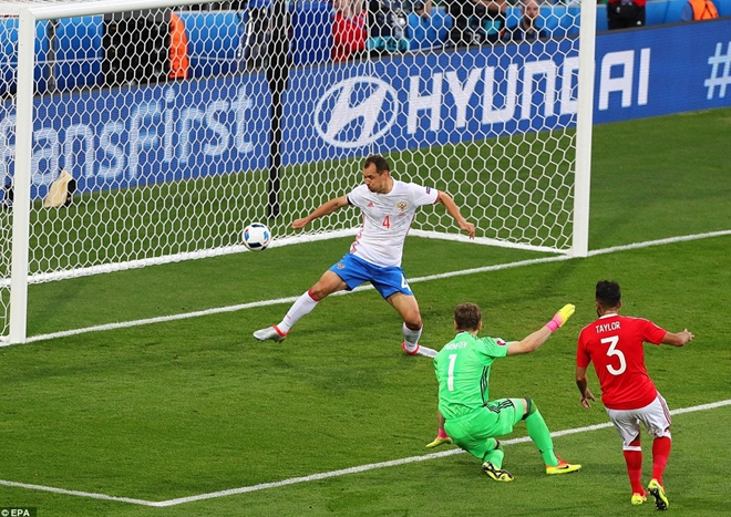 Hậu vệ Nga ngăn cản thành công Gareth Bale, bóng bật ra đúng tầm chân của Taylor đang băng xuống. Và cũng phải mất tới hai cú dứt điểm, hậu vệ này mới giúp xứ Wales gia tăng cách biệt lên 2 bàn.