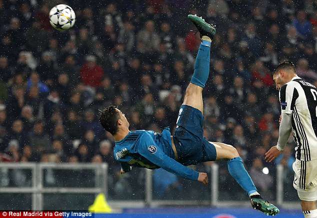 Trong trận đấu tại Turin sáng nay, siêu sao người Bồ Đào Nha đã thực hiện một bàn thắng xứng đáng gọi là tuyệt phẩm. Từ quả tạt bên cánh phải của Dani Carvajal, , Ronaldo xoay người đứng quay lưng với khung thành rồi bật lên thực hiện động tác xe đạp chổng ngược.
