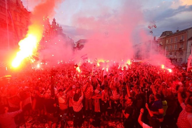 | Tại quê nhà Croatia, hàng nghìn người hâm mộ đổ ra đường ăn mừng chiến thắng. Pháo sáng được đốt lên trong tiếng reo hò hạnh phúc của người hâm mộ |