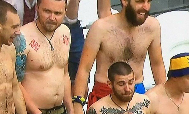 Kênh ITV của Anh trong lúc tường thuật trận đấu giữa Ukraine với Bắc Ireland đã vô tình ghi lại được hình ảnh một số cổ động viên bên phía Ukraine ngực trần, xăm trên mình hình chức thập ngoặc (Biểu tượng một thời của phát xít Đức trong thế chiến thứ hai).