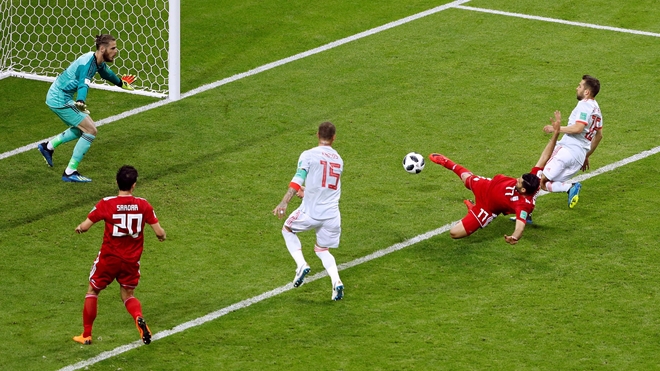 Không chỉ phòng ngự tốt, các cầu thủ Iran còn tạo ra không ít sóng gió trước khung thành của đội tuyển Tây Ban Nha. Và một trong số đó suýt chút nữa đã trở thành niềm vui khi các học trò của HLV Queiroz đã có 1 lần làm tung lưới thủ thành De Gea. Tuy nhiên, công nghệ hỗ trợ trọng tài VAR đã từ chối bàn thắng của đội bóng đến từ châu Á.
