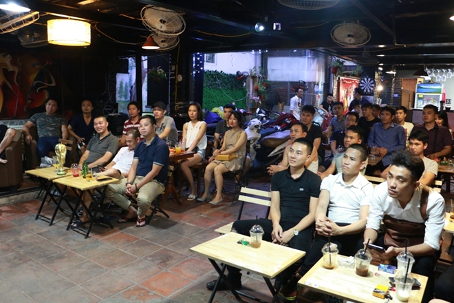 | Một quán cà phê trên phố Xã Đàn (Hà Nội) chật kín chỗ ngồi xem trận khai mạc giữa hai đội Nga và Saudi Arabia. |