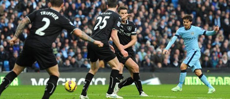 | Davis Silva (áo xanh) ghi bàn mở tỷ số cho Man City giữa vòng vây của các cầu thủ Burnley (ảnh BBC.com). |