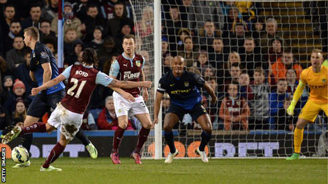 Bàn thắng của George Boyd ở phút 61 đã đem về không chỉ chiến thắng không tưởng cho Burnley mà còn đe dọa lớn đến hành trình bảo vệ ngôi vương của Man City. Bàn thắng được ghi từ tình huống đánh đầu phá bóng không cẩn thận của cầu thủ đội trưởng Man Cty, Vincent Kompany sau pha đá phạt ngoài vòng cấm. Bóng đến chân Boyd đang đứng sát vạch 16m50 và anh nhanh như cắt tung ra cú đá nối bằng chân trái, bóng đi thấp vào thẳng lưới nhà ĐKVĐ.