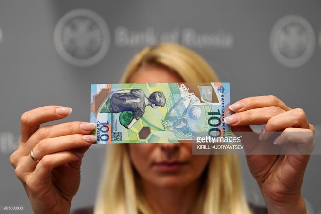 | Tờ tiền lưu niệm 100 Ruble của Nga được Ngân hàng Trung ương Nga phát hành riêng cho World Cup 2018 đang được người hâm mộ săn lùng. |