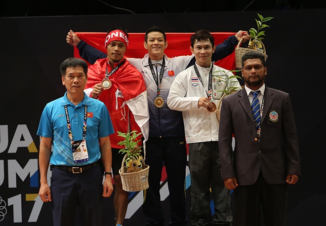 | Trịnh Văn Vinh trên bục nhận HCV. Anh là người thứ hai mang vàng về cho đội tuyển cử tạ Việt Nam tại SEA Games 29, sau VĐV Thạch Kim Tuấn (hạng 56 kg). Ảnh: Tiến Tuấn. |