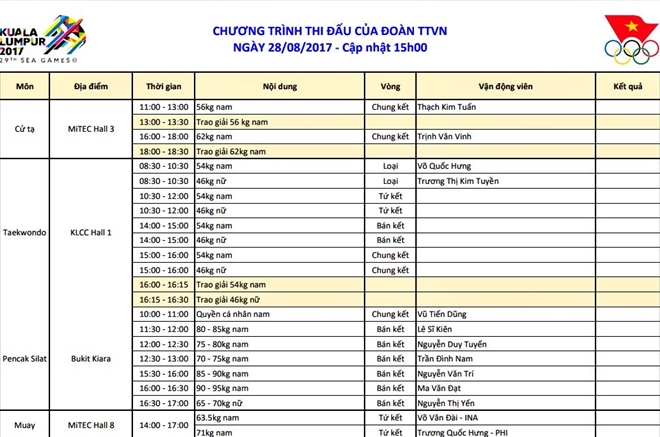 | Lịch thi đấu của Đoàn Việt Nam ngày 28-8. |