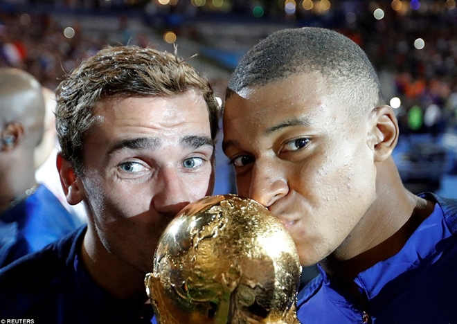 | Griezmann cùng Mbappe hôn chiếc cup vàng World Cup. Dù chơi cho các CLB khác nhau nhưng khi khoác lên mình chiếc áo của Les Bleu tất cả đều cống hiến hết mình vì đội tuyển quốc gia. |