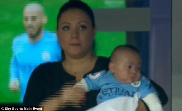 | David Silva mang cậu con trai đầu lòng Mateo tới sân trong trận đấu giữa Man City chống Huddersfield. |