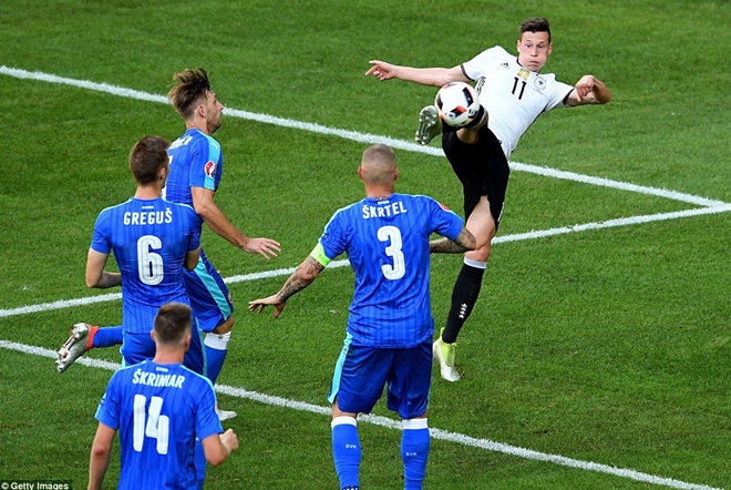 Phút 63, từ quả đá phạt góc bên cánh phải do Kroos thực hiện, Hummels đánh đầu chuyền bóng thuận lợi để Draxler ra chân sút bóng sống đẹp mắt để nâng tỉ số lên 3 - 0 cho đội bóng áo trắng trước Slovakia.