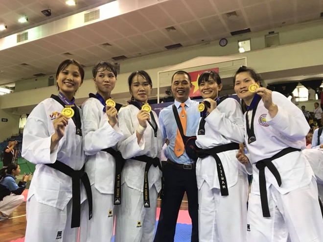 | Hà Thị Nguyên (phải, ngoài cùng) tại Giải Taekwondo vô địch quốc gia năm 2017. |