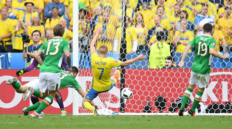 | Một pha tranh cướp bóng giữa cầu thủ đội Thủy Điển và đội tuyển Ireland. Ảnh: Reuters. |
