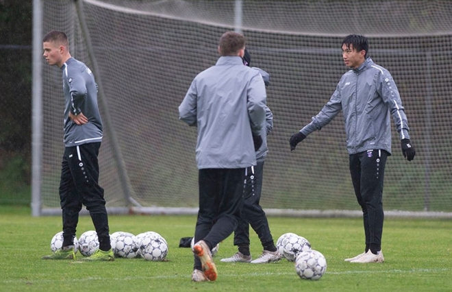 | Văn Hậu đội mưa luyện tập. Ảnh: Heerenveen |