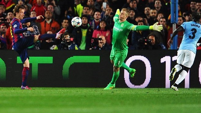 Chủ nhà chơi rất nhàn nhã và thường xuyên tạo được cơ hội nhưng dường như thiếu may mắn khi bộ ba MSN liên tục vô duyên trước khung thành Joe Hart, phải đợi tới khi hiệp 1 trôi qua hai phần ba thời gian thì cổ động viên Barca mới có dịp ăn mừng. Trong tình huống lên bóng phút 31, Messi dẫn bóng đột phá bên cánh tung cú chuyền lật cánh sang cho Rakitic, cầu thủ người Croatia đỡ bóng bằng ngực trước khi tung cú dứt điểm qua đầu thủ thành Joe Hart ghi bàn thắng duy nhất của trận đấu.