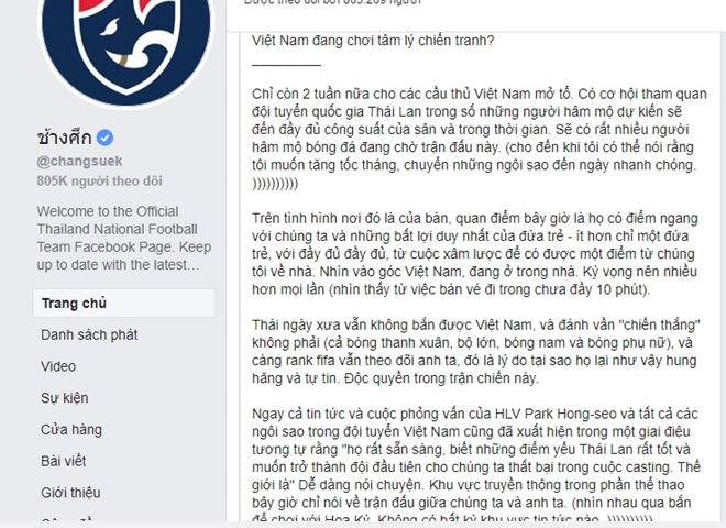 "HLV trưởng của ĐT Việt Nam là Park Hang-seo và các ngôi sao trong đội hình của họ đều trả lời báo chí rằng họ đã nắm được điểm yếu của Thái Lan và sẽ trở thành đội đầu tiên ở bảng G đánh bại Thái Lan. Có vẻ như đó chính là đòn tâm lý mà Việt Nam đang tạo ra để khiến tinh thần các cầu thủ Thái Lan không còn được giữ ở trạng thái ổn định", tài khoản Changsuek cho hay.