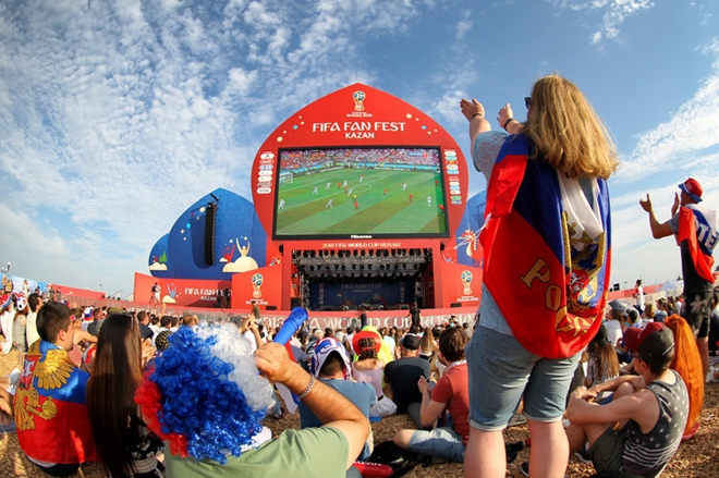 | Khu vực Fanzone đông nghịt CĐV chứng kiến trận đấu nảy lửa giữa Nga và Tây Ban Nha. Hình ảnh các CĐV của tuyển Nga lo lắng khi Ignashevich lóng ngóng phản lưới nhà bằng bắp đùi. |
