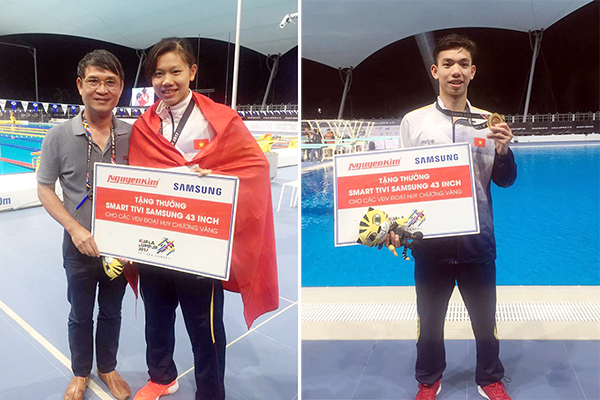 | Nguyễn Huy Hoàng và Ánh Viên nhận thưởng nóng từ nhà tài trợ sau khi đoạt HC vàng. |