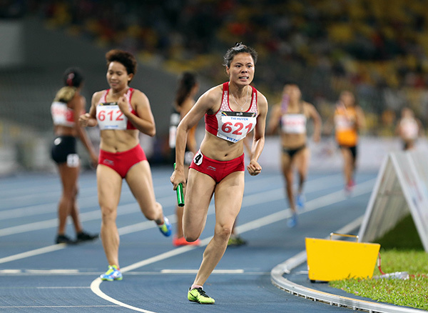| Nguyễn Thị Oanh, Quách Thị Lan và Hoàng Thị Ngọc làm rất tốt phần việc của họ trong ba vòng 400m đầu, trước khi Ngọc trao gậy lại cho Nguyễn Thị Huyền. |