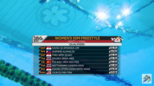 Ánh Viên thất bại ở nội dung 50m tự do, khi chỉ về đích thứ sáu. Như vậy, nữ kình ngư của Việt Nam kết thúc SEA Games năm nay với 8 HC vàng - tương tự như hai năm trước ở Singapore.