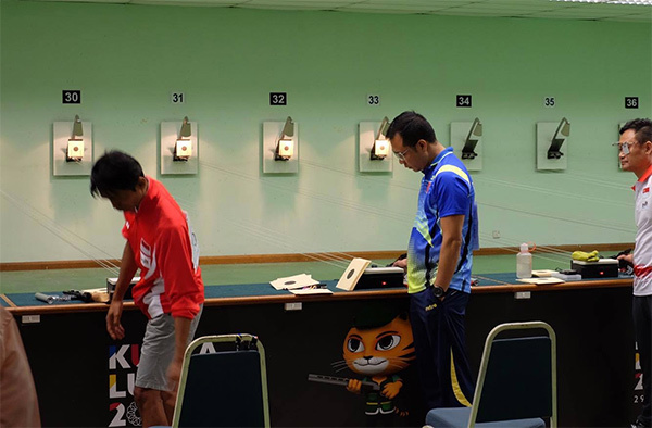 Hoàng Xuân Vinh và Quốc Cường đang thi đấu vòng loại 10 m súng hơi nam.