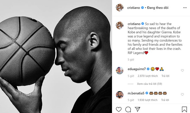 "Thật buồn khi nghe Kobe và con gái Gianna đã mãi mãi ra đi. Kobe thực sự là một huyền thoại và là nguồn cảm hứng cho rất nhiều người. Xin gửi lời chia buồn đến gia đình và bạn bè của anh cùng gia đình của tất cả những người đã thiệt mạng trong vụ tai nạn. Yên nghỉ nhé, huyền thoại", siêu sao bóng đá Cristiano Ronaldo nghẹn ngào viết trên Instagram cá nhân.
