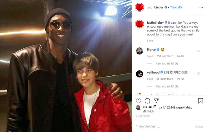 Đăng một bức ảnh chụp chung với Kobe Bryant từ hồi còn mới nổi, ca sĩ Justin Bieber xúc động cho biết: "Không thể nào, anh luôn là người ở bên và động viên em, Mamba (biệt danh của Kobe Bryant). Anh đã cho em nhiều lời khuyên và khiến chúng ta có thể vui vẻ cả ngày. Yêu thương anh rất nhiều".