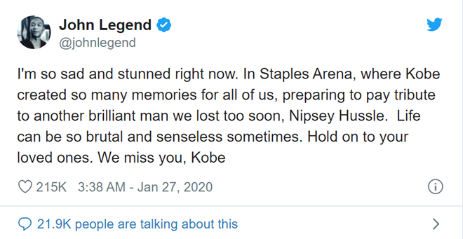 Chủ nhân của bản hit All of me - nam ca sĩ nổi tiếng John Legend không giấu nổi sự xúc động. Trên trang Twitter cá nhân, anh viết: "Tôi hiện đang rất buồn và vô cùng choáng váng. Có quá nhiều kỷ niệm đẹp mà Kobe để lại cho chúng ta tại Staples Arena (sân nhà của LA Lakers). Cuộc sống đôi khi rất tàn bạo và vô cảm, nên tất cả cần phải luôn ở bên cạnh những người thân yêu của mình".