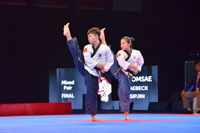 Đội taekwondo vừa xuất trận đã mang về cho đoàn thể thao Việt Nam chiếc HC vàng đầu tiên trong ngày thi đấu hôm nay 12/6, khi đôi Nguyễn Minh Tú và Nguyễn Minh Văn giành số điểm cao nhất 7.885 trong bài biểu diễn quyền.
