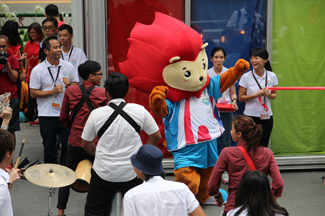 | Linh vật và ngọn đuốc SEA Games 28 trong một sự kiện chào đón Đại hội thể thao Đông Nam Á (SEA Games) tại Singapore. |