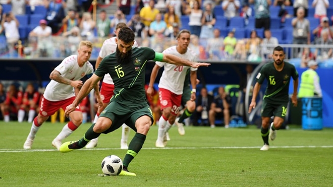 38': Tiền vệ Mile Jedinak của Australia đánh lừa hướng phán đoán của thủ thành Schmeichel trên chấm phạt đền ghi bàn cân bằng tỷ số cho Australia.